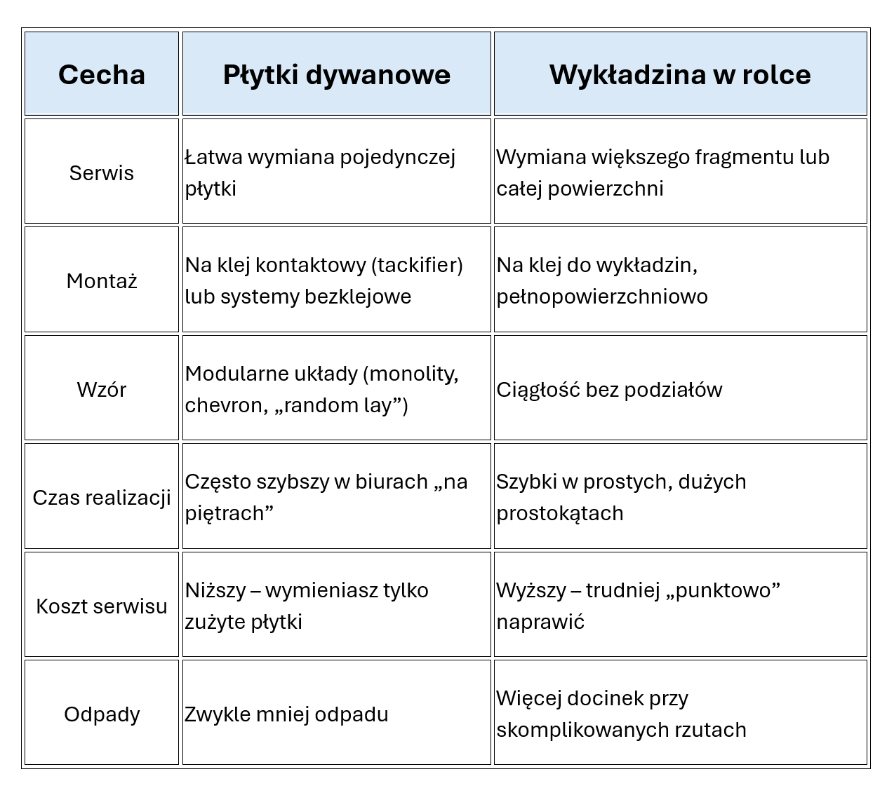 Płytki dywanowe vs wykładzina w rolce – szybkie porównanie (tabela)